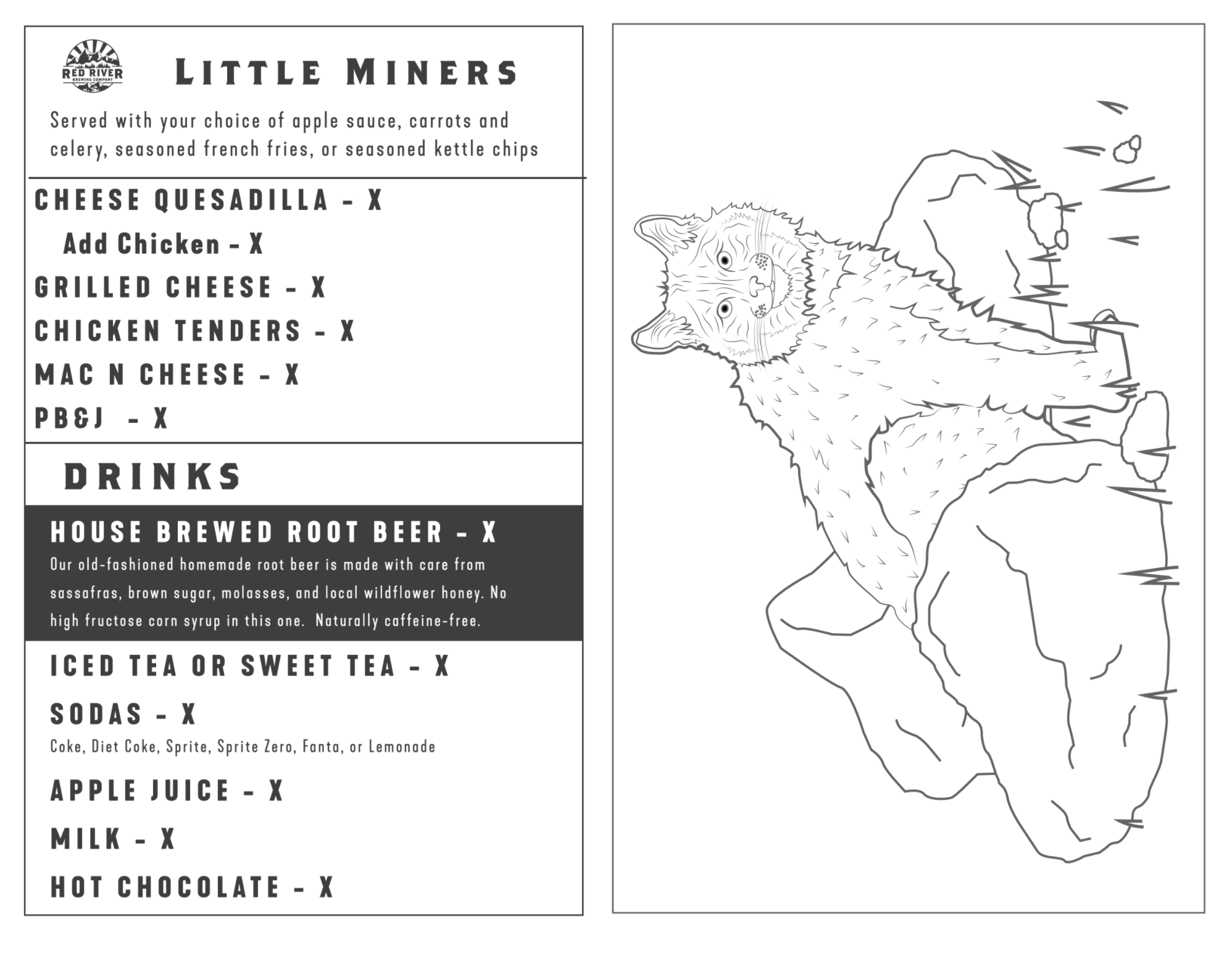 Yes, it’s a brewery and distillery, but RRBC strives to be a family-friendly pub that caters to children of all ages. We all miss the days of crayon baskets and competing with our siblings to make the coolest drawings. These kids menus help kids see and appreciate the local wildlife of Northern New Mexico, while their parents appreciate the fine drinks from the bar.